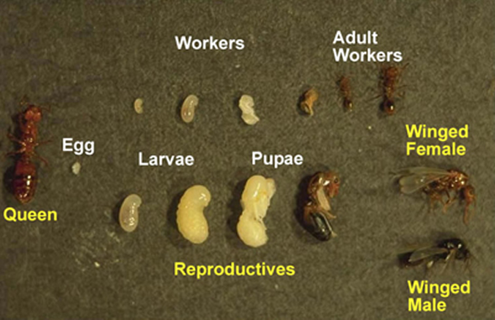 The ants, like other members of the order Hymenoptera, exhibit complete metamorphosis with four major life stages, egg, larva, pupa and adult. Most colonies feature several distinct castes that include a reproductive queen (sometimes several), whose sole purpose is to produce offspring and sterile female workers that perform tasks from nursing to foraging to colony defense. Males typically serve only to mate with queens, after which they promptly die. |