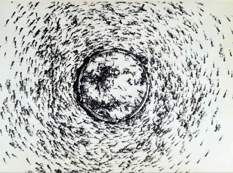 | Communication underpins ant society. Using chemical pheromones, touch, and sometimes sound, ants create complex information networks. When a forager discovers food, she lays a scent trail back to the nest, recruiting nestmates who reinforce successful paths with additional pheromones. This simple feedback mechanism creates efficient transportation routes that mathematicians have used to inspire optimization algorithms for human logistics and telecommunications networks. But it can also leads to the dynamic that causes ants whose pheromone trail has been interrupted by a petrie dish to circle around the dish endlessly until they perish. |