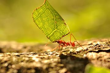 Weaver ants of the genus Oecophylla constuct nests by folding and silking together the edges of leaves, a construction method shared by some caterpillars and solitary bees. This species of ant is able to lift objects up to 100 times its weight. Proportionally, this would be equivalent to a human lifting a 10-ton truck. |