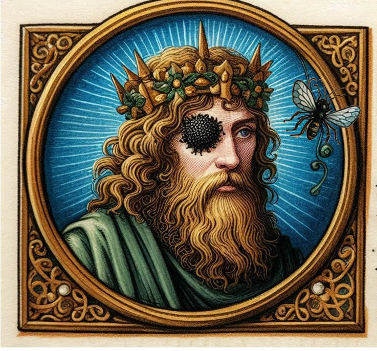 | In another Irish account, bees were at the root of a dispute that ended in war. Congal, the heir to the throne of Ulster, was stung in the eye by a bee while a guest in the house of Domnall, king of Ireland. He was blinded (and was known by the moniker "Caech", meaning "One-eye", thereafter). His kinsmen demanded the forfeiture of the eye of Domnall's son as retribution but Domnall ordered that the colony of bees should be destroyed instead-- to ensure that the guilty bee would perish. (Evidently, Domnall was a better king than he was a beekeeper, as any beekeeper knows that a bee dies after it stings.) |