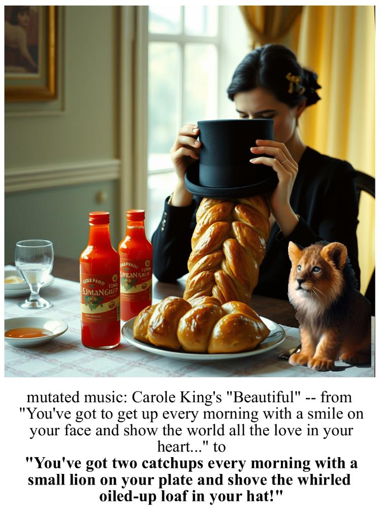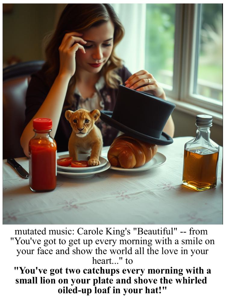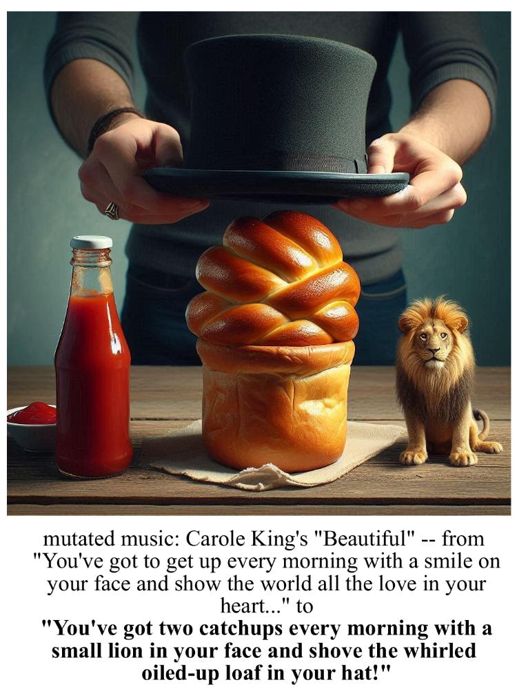 The lead image, and similar, are not based on a mondegreen, per se, but on alternate lyrics that I wrote-- which I thought mimicked the original... and I liked the weird imagery that the AI created from the description so I did several versions, tweaking the words a bit.