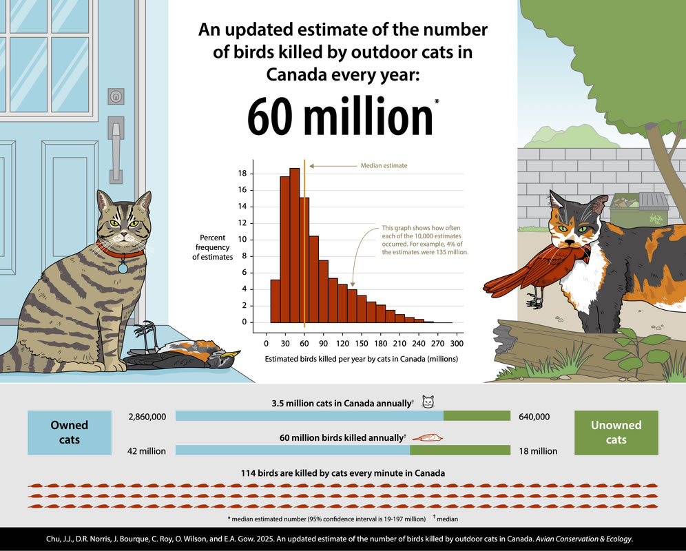 Studies show that cats often do not eat all the prey they catch; many kills are left uneaten, indicating that hunting is driven by instinct rather than hunger. In North America, free-ranging domestic cats kill an estimated 1.3–4 billion birds annually, making them one of the most significant human‑associated threats to avian populations. Cats’ hunting impact is magnified in island ecosystems; in places like the Florida Keys and Hawaiian archipelago, they have contributed to local extinctions of endemic bird species. Cats also kill 6–22 billion small mammals annually in the U.S., including native species such as chipmunks and voles, altering local food webs. Ground-nesting birds are especially vulnerable: species like the Piping Plover and California Least Tern face predation pressure from feral and outdoor cats, compounding habitat loss. A 2025 study revised estimates of cat-caused bird mortality in Canada to between 19 and 197 million birds annually (with a median of 60 million), which is 71% lower than a 2013 estimate, primarily due to more accurate field survey data on outdoor cat populations rather than any actual decline in predation rates.
